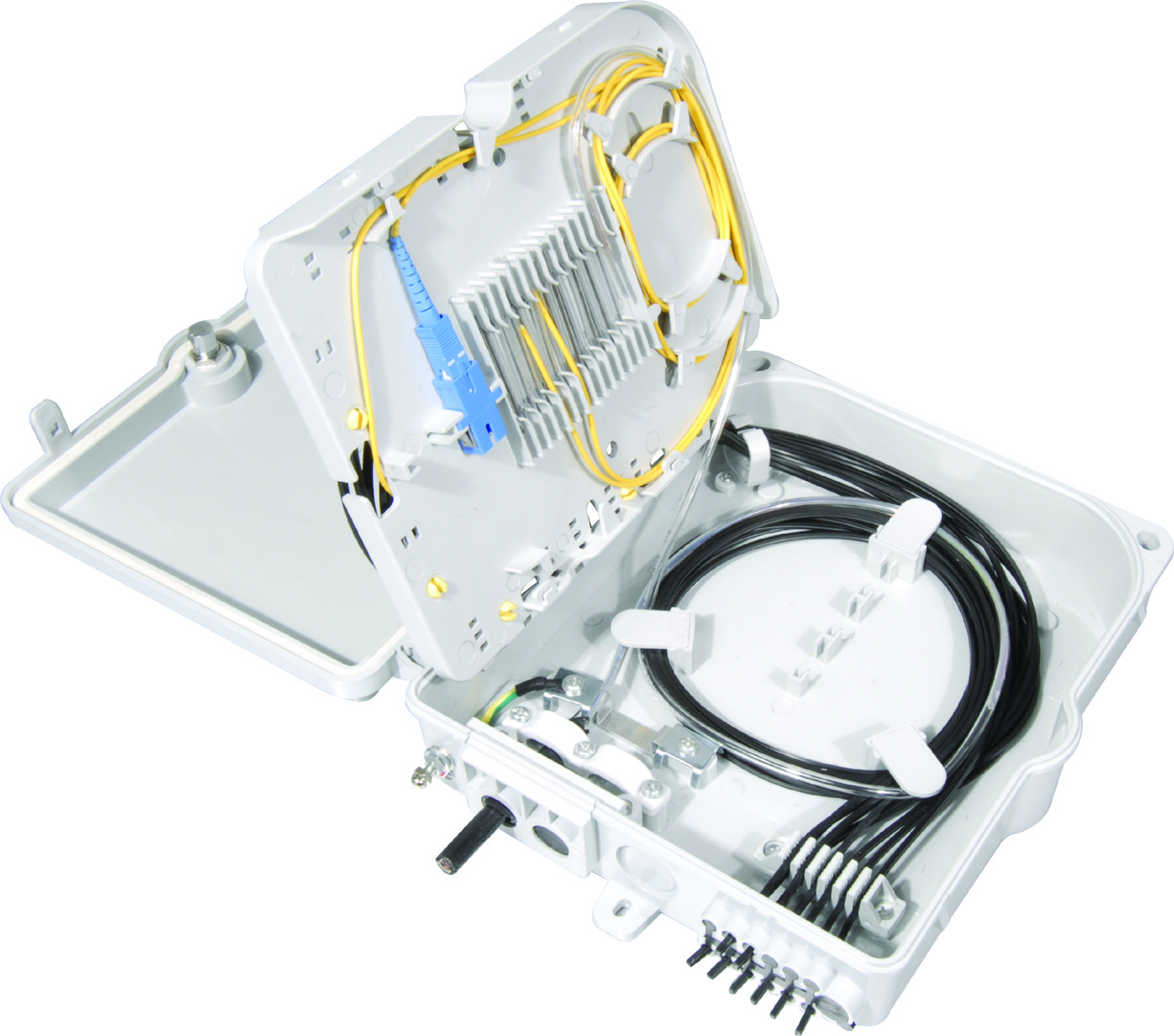 FDB-G-8H is used as a termination point for the feeder cable to connect with drop cable in FTTx communication network system. The fiber splicing, splitting and distribution can be done in this box, and in meanwhile, it provides solid protection and management for the FTTx network building