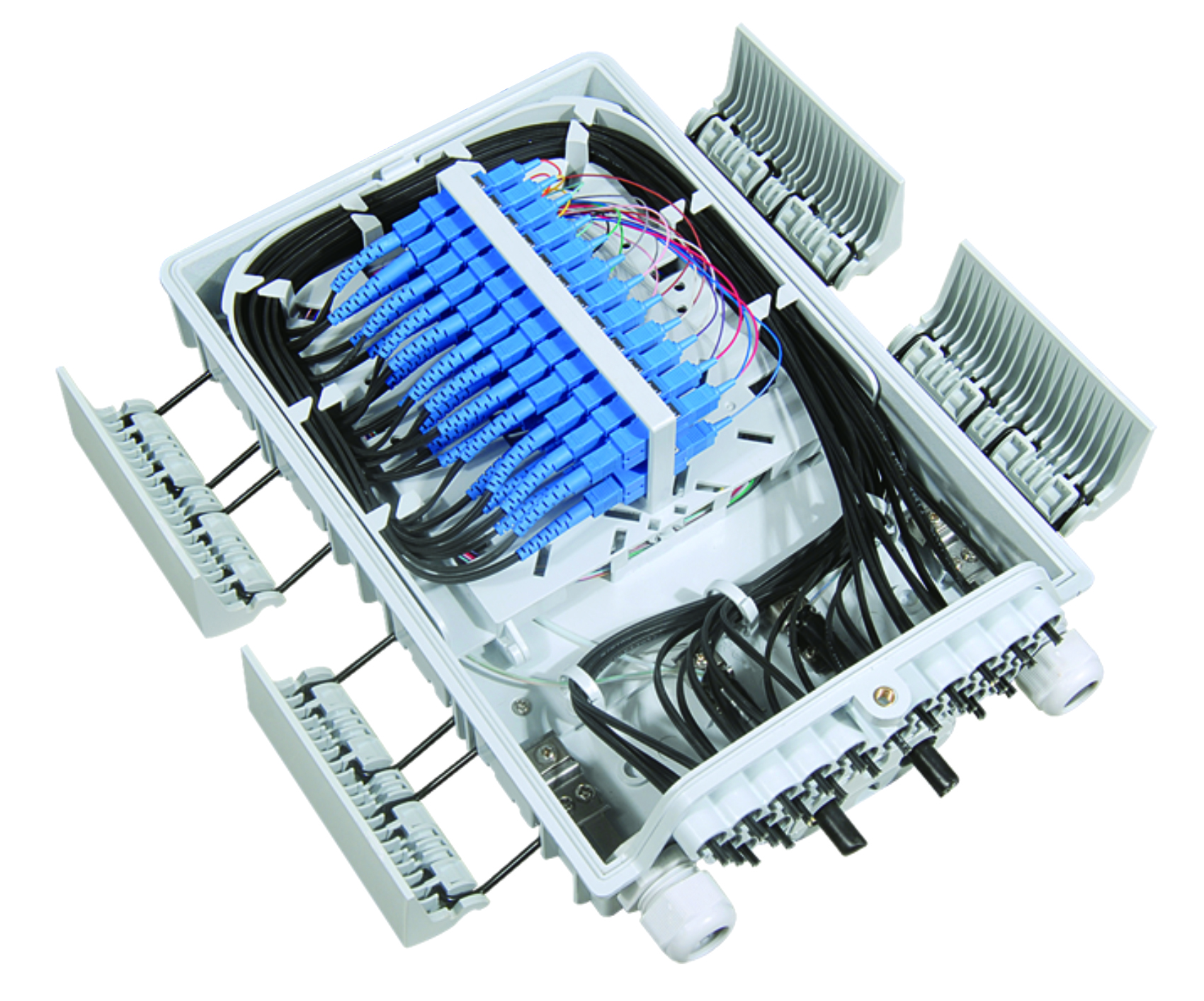 FDB-G-24N is used as a termination point for the feeder cable to connect with drop cable in FTTx communication network system. The fiber splicing, splitting and distribution can be done in this box, and in meanwhile, it provides solid protection and management for the FTTx network building