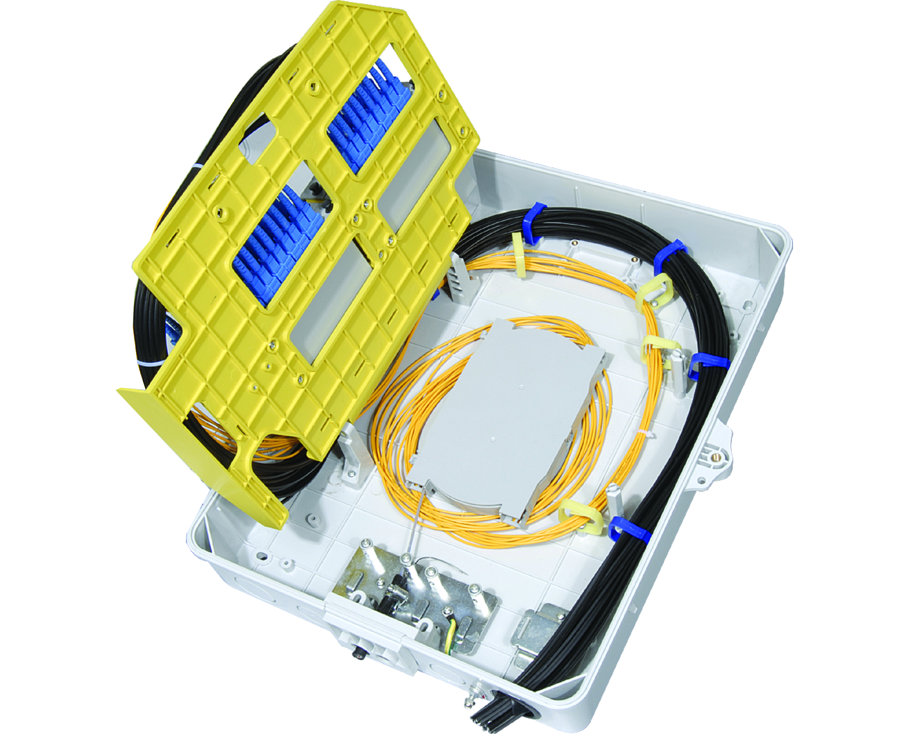 FDB-G-32B is used as a termination point for the feeder cable to connect with drop cable in FTTx communication network system. The fiber splicing, splitting and distribution can be done in this box, and in meanwhile, it provides solid protection and management for the FTTx network building