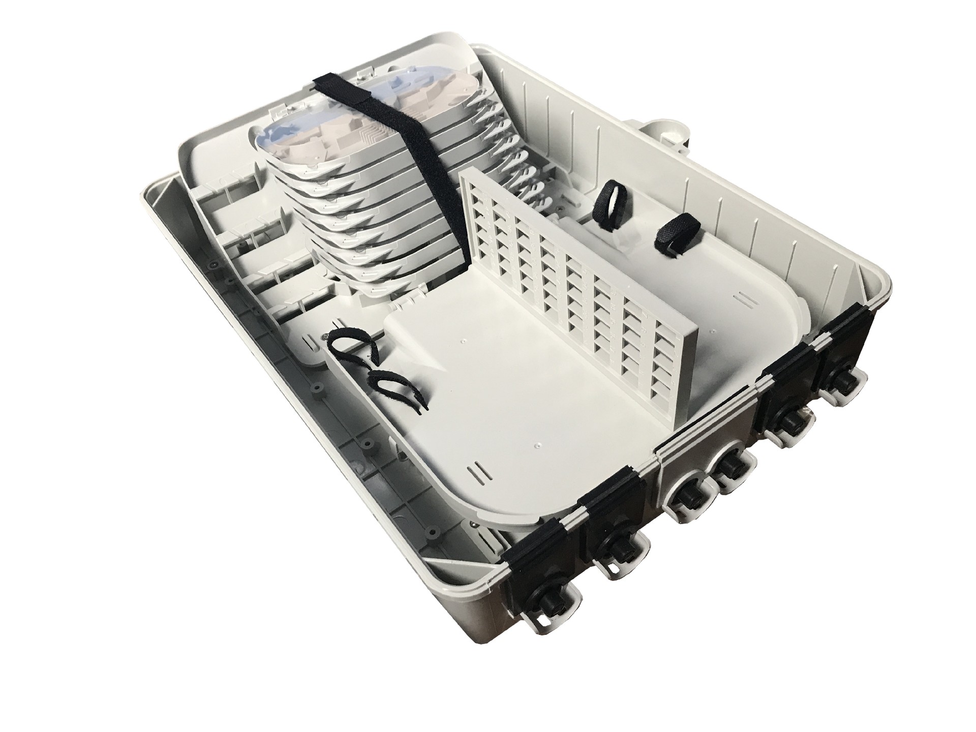 FDB-G-48H is used as a termination point for the feeder cable to connect  with drop cable in FTTx communication network system. The fiber splicing, splitting  and distribution can be done in this box, and in meanwhile, it provides solid  protection and management for the FTTx network building