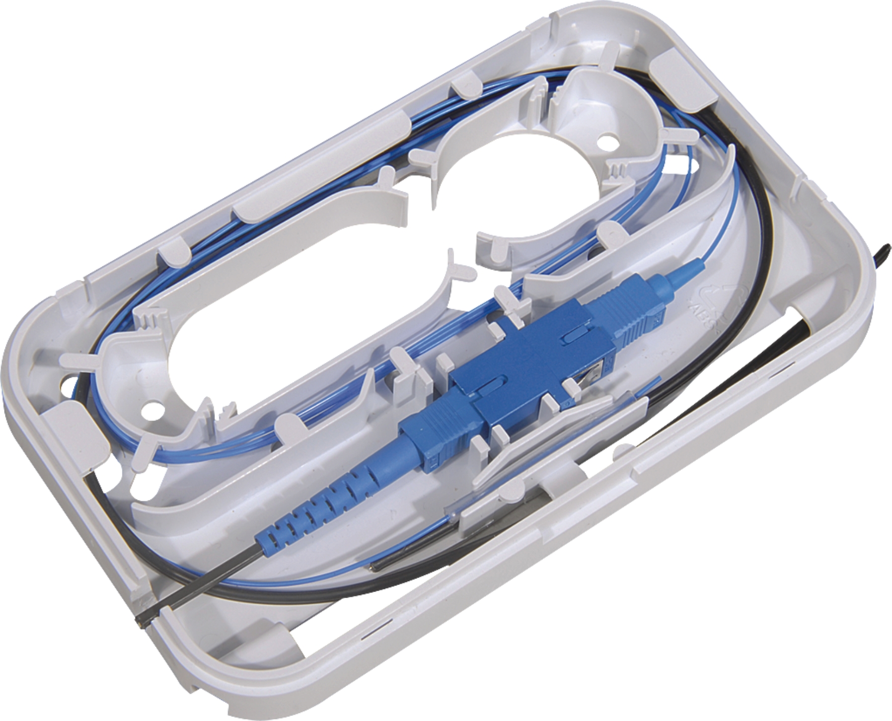 This wall box enables the installation of either Drop cable or ruggedized cables to be spliced to 1 SC Pigtail.